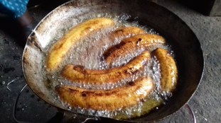 Die bananen hebben trouwens nog wel een staartje. Nadat het merendeel met oudjaar in onze maaltijd is gegaan, maak ik me op nieuwjaarsdag op voor onze volgende reis. Maar Aimée wil per sé voor vertrek het restant opbakken. ‘Waarom?’ vraag ik, bang voor het zoveelste oponthoud.