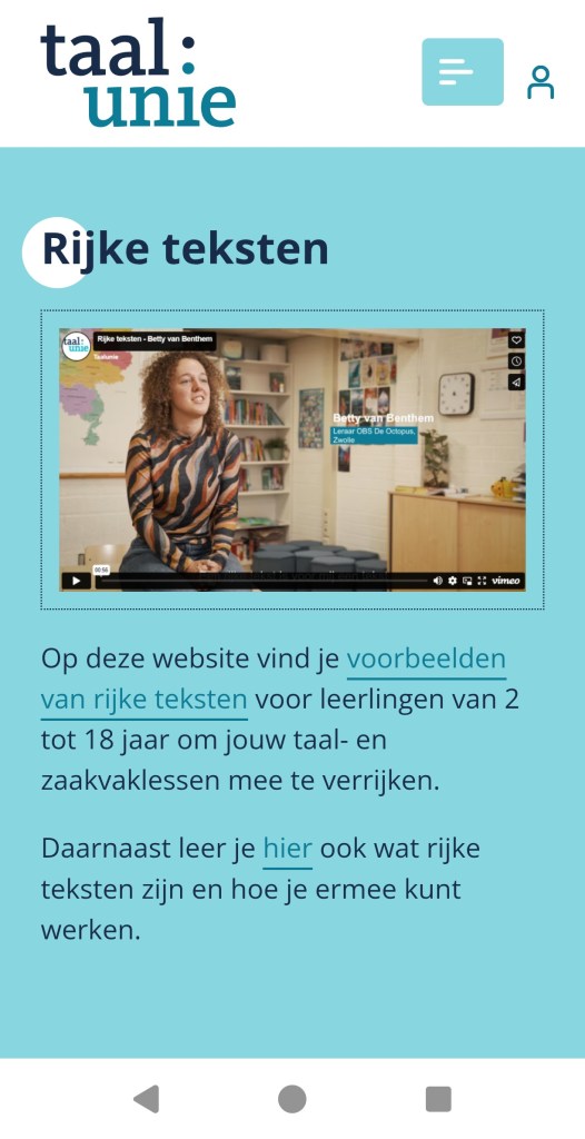 Nieuwsgierig ga ik surfen op internet. Taalunie blijkt de organisatie te die het beleid voor het Nederlands ontwikkeld en stimuleert.[1] Hun website rijketeksten.org geeft voorbeeldteksten voor leerlingen van 2 tot 18 jaar. Deze kunnen ingezet worden als lesmateriaal.