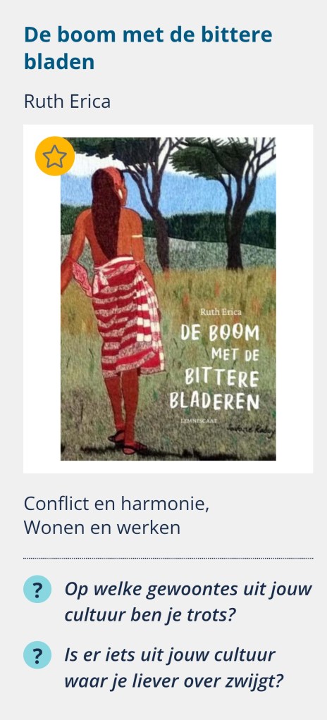 Door bij de zoekfunctie De boom met de bittere bladeren in te voeren, vind ik het fragment.[2] Ze hebben gekozen voor hoofdstuk 8 met de titel Cadeau van God. Ernaast een afbeelding van de cover, een tweetal lezersvragen (zie afbeelding) en linkjes naar het boek in de Vlaamse en Nederlandse bibliotheek.