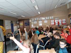 Het eerste dat me bij groep 5 & 6 opviel, was de gretigheid van de kinderen. Nog voordat de schrijfster een woord had gezegd, staken er al heel wat vingers in de lucht. ‘Jullie mogen je vragen voor straks bewaren,’ zei Mina, en ze begon haar verhaal.