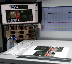 Mijn cover is al in de maak. Ik zie hem op een gladde tafel liggen en op een groot computerscherm. De machine ernaast braakt onophoudelijk nieuwe exemplaren uit. Een medewerker vist er telkens eentje uit. Als die niet goed is, kan hij de machine bijstellen.