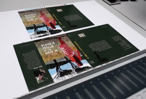 Het drukken gaat razendsnel. Deze machine haalt wel 20.000 afdrukken per uur, zegt de medewerker trots. Nu maken ze prints voor mijn stofomslag[2] en hardcover. Wanneer hij zijn vinger over de cover haalt, loopt de kleur uit. De verf was blijkbaar nog nat.