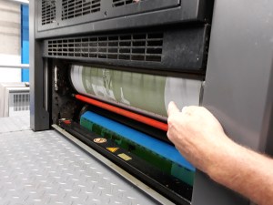 Boven het lawaai uit geeft hij uitleg. Er zijn vier basiskleuren: geel, rood, blauw en zwart.[1] Daarmee kan je alle kleuren mengen. Mijn cover wordt gedrukt op hagelwit papier. Er zit een chemische stof in waardoor het gaat glanzen.