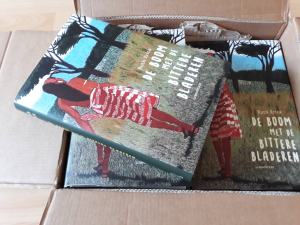 Hij kiest een mooi exemplaar uit de stapel en geeft die aan mij. Als een trofee houd ik hem vast. Voor het eerst kan ik De boom met de bittere bladeren aanraken. Zo dicht ben ik nog nooit bij mijn boek geweest.