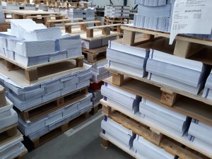 We maken een rondgang langs de betreffende machines. Sommigen maken zo’n herrie dat de medewerker ernaast oordopjes in heeft. De techniek gaat me boven de pet, maar de basis lijkt eenvoudig: hier wordt het drukwerk gesneden en gesorteerd.